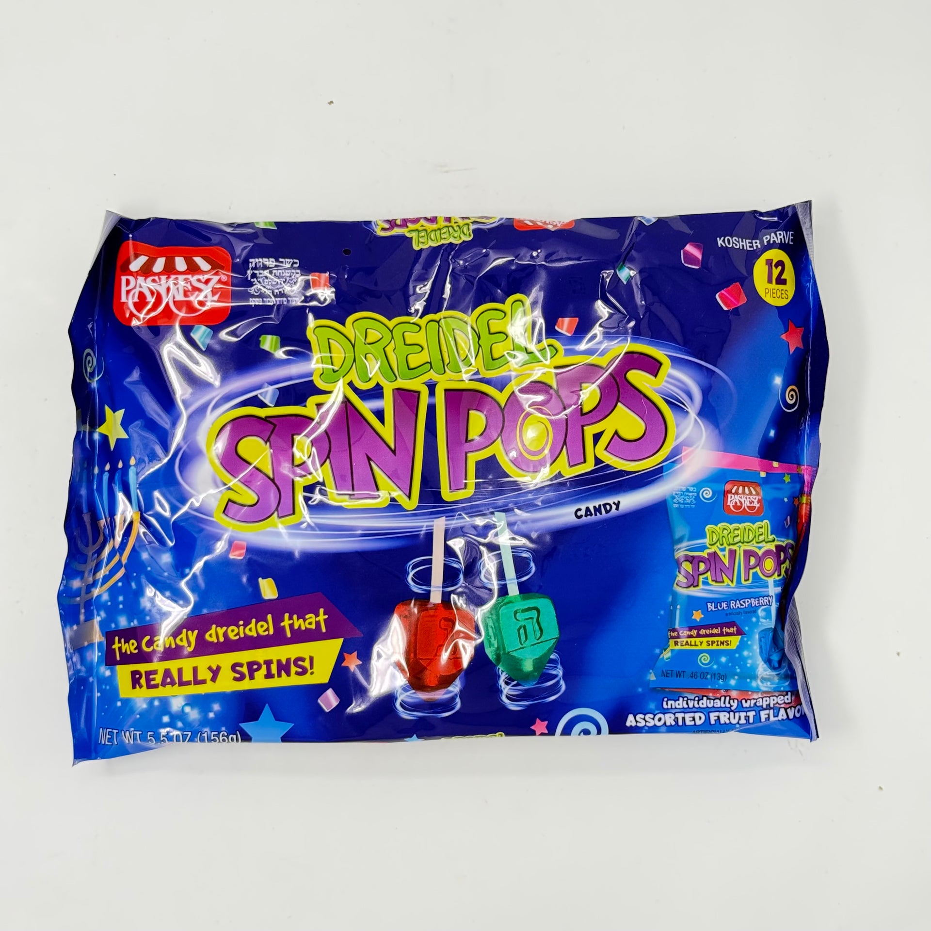 Add fun and flavor to your Hanukkah celebration with these delightful Dreidel Spin Pops! Each pack contains 12 individually wrapped candies designed to look like and actually spin like real dreidels. These playful treats combine the joy of Chanukah tradition with delicious assorted fruit flavors, including a special blue raspberry dreidel.